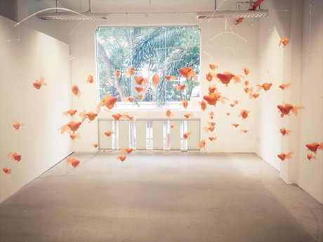 " Visitor are invited to enter a fish tank filled with floating handcrafted goldfishes."